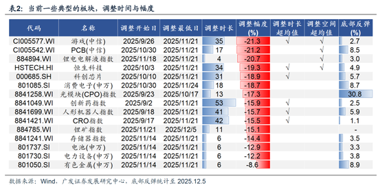 11月下旬,游戏、恒生科技的调整时间和空间都已超过历史均值(20个交易日,调整幅度18%),PCB、科创芯片、消费电子、创新药、机器人、CRO指数调整时间足够,调整空间超过15%。